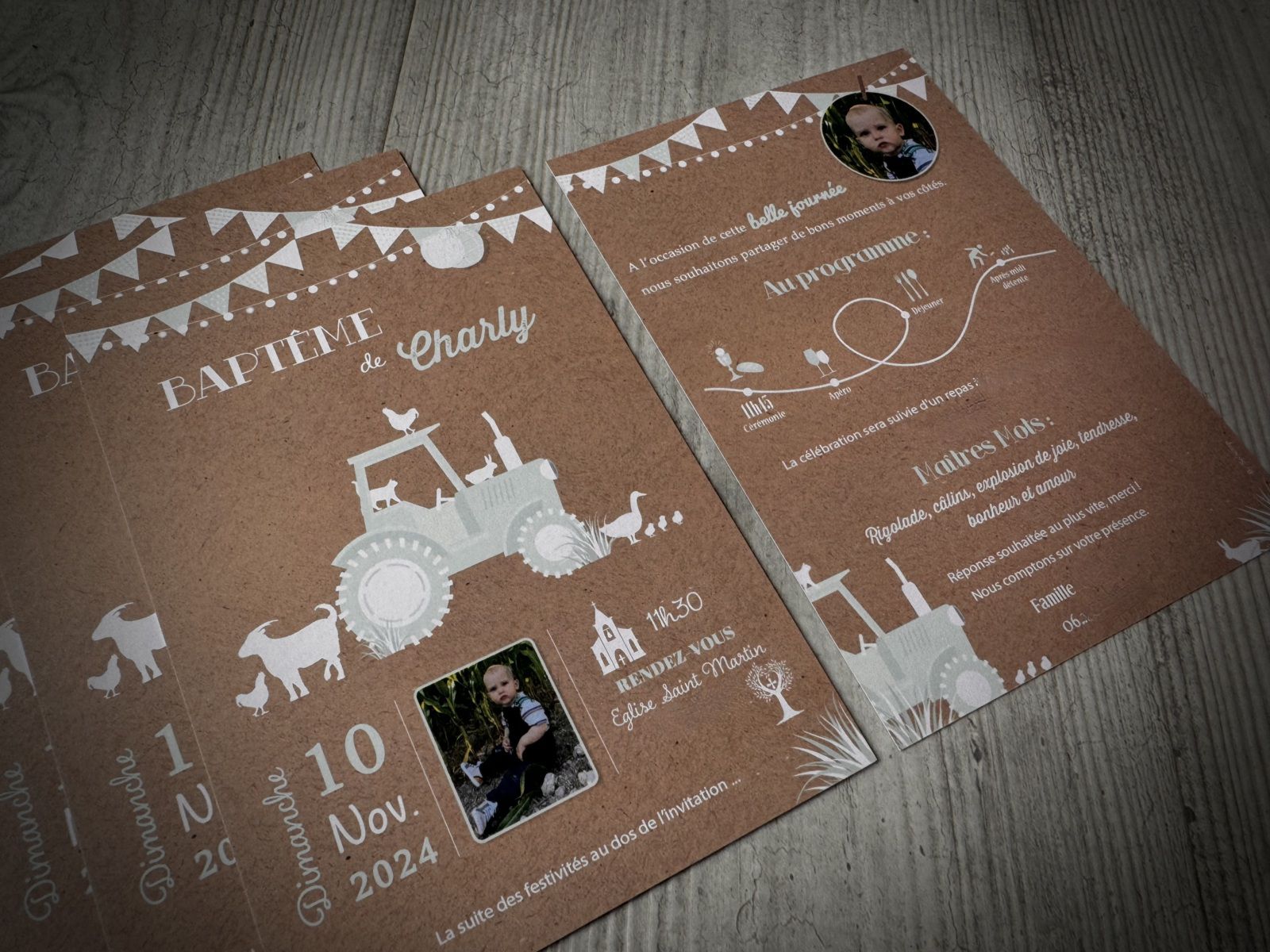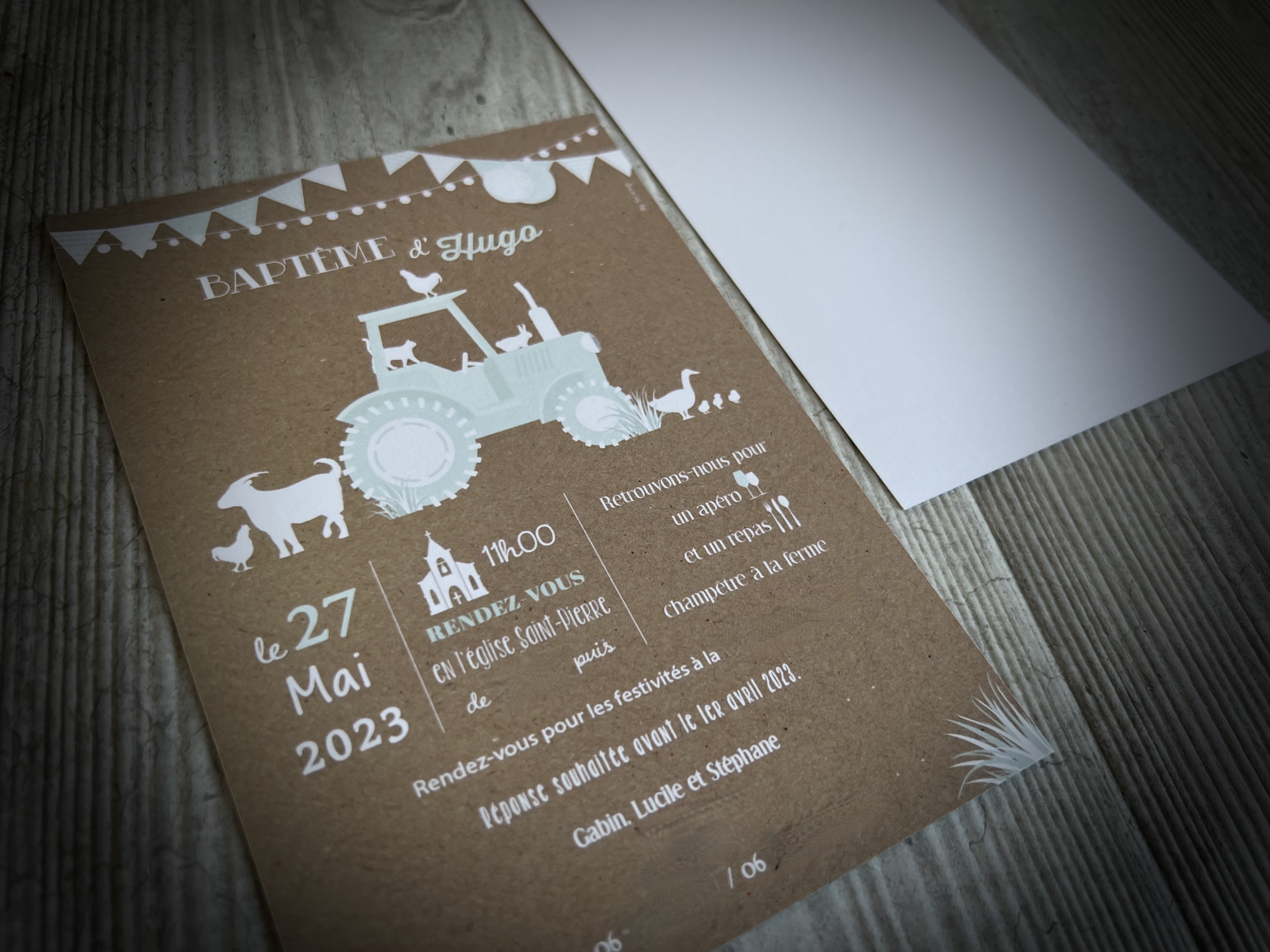 L’idée de la corde à linge, pince à linge, le mot BAPTÊME suspendu