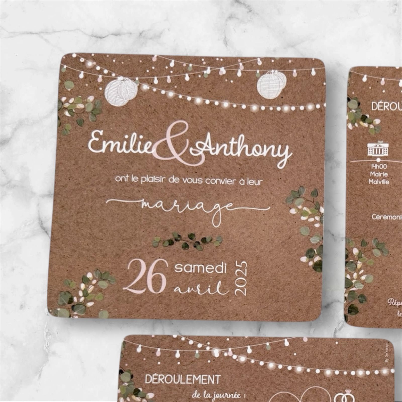 Pour un mariage tout en douceur et en élégance, cette invitation mise sur l’harmonie parfaite entre le brut du kraft et la finesse de l’eucalyptus. Les touches de rose poudré et de vert sauge apportent ce romantisme tant recherché, tandis que le carton brunch assorti permet de clôturer votre week-end de fête avec style. Une création personnalisée signée EFDC by So’scrap, pensée pour les amoureux de la nature et du détail.